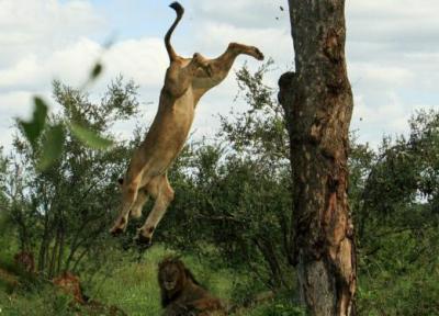 این شیر برای فرار از 7 شیر نر که در پی او بودند از بلندترین درخت اطراف بالا رفت.