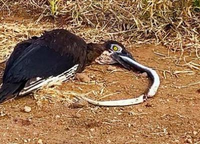 اگر لقمه ای بزرگتر از دهان بردارید، عاقبت خوشی در انتظارتان نیست. این اتفاقی است که برای منقار شاخی جوان افتاد.